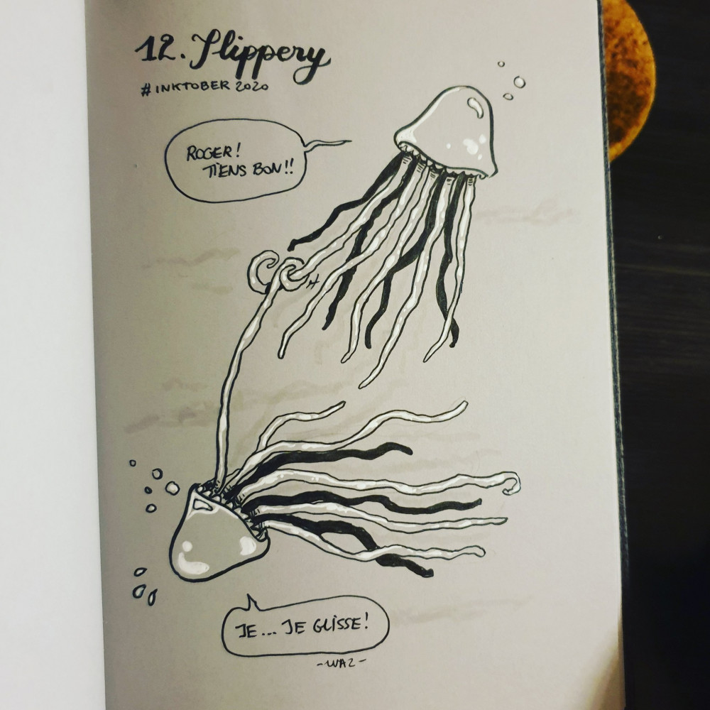 (Il y a actuellement une polémique autour du créateur d'Inktober, Jake Parker, pour des histoires de copyright - ses avocats ont resserré la vis - et une accusation de plagiat par un autre auteur. Je me suis renseignée sur les deux et je suis plus que sceptique sur le bien-fondé de cette indignation générale... comme j'estime ne pas être compétente pour en juger, je vais atteindre de voir comment ça évolue plutôt que de hurler au scandale sans trop savoir de quoi je parle. Twitter, tu me fatigues.)