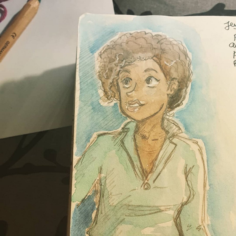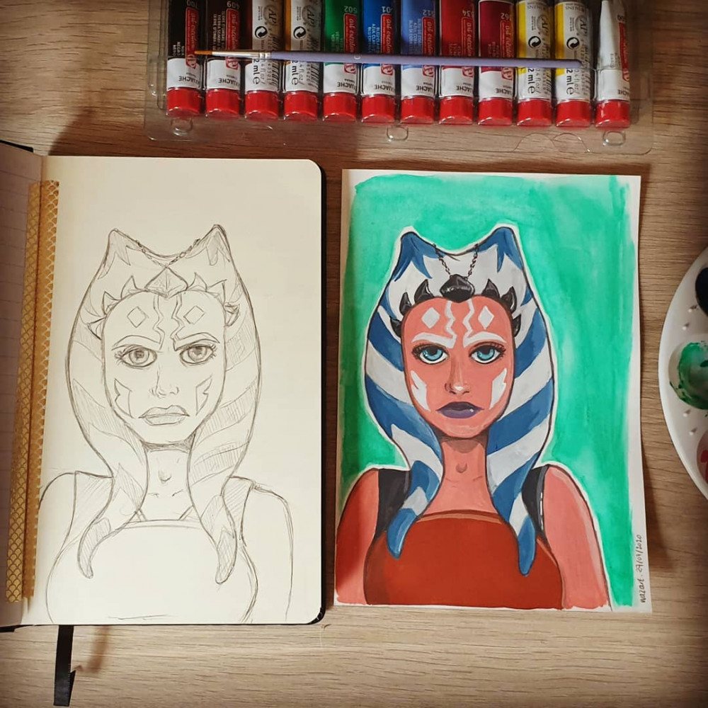 J'ai fait une pause "illustration" pour voir ce que ça pouvait donner avec autre chose que des paysages. Chéridamour regardait les Star Wars: The Clone Wars, et sur un coup de tête, je suis partie sur un petit fanart d'Ahsoka. Ce faisant, j'ai appris que je n'aime pas sur-diluer la peinture (cf le fond), et que j'aime bien le rendu des contours directement tracés en couleur à la gouache :