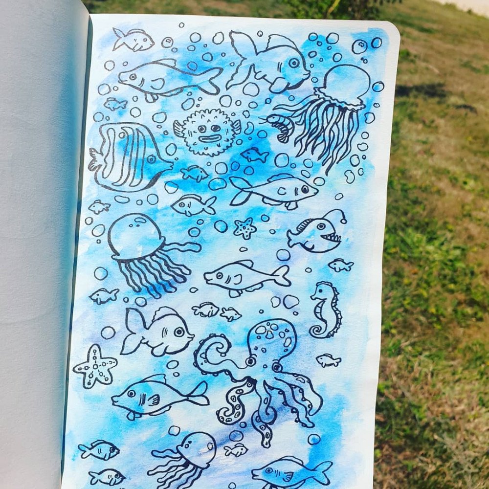 L'idée, c'était de noircir ensuite tout l'extérieur pour n'avoir que les bestioles à l'aquarelle. Mais finalement je l'ai trouvé chouette comme ça... Donc je ferai l'essai sur autre chose !