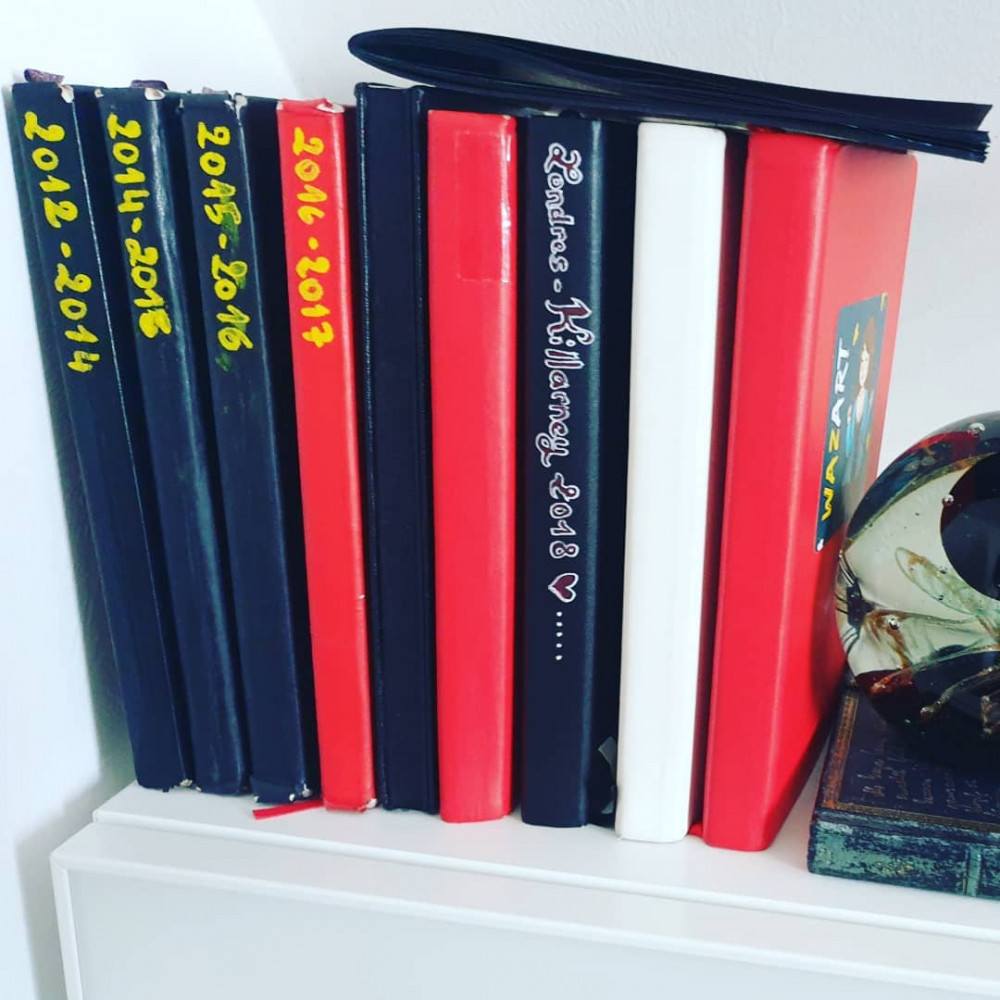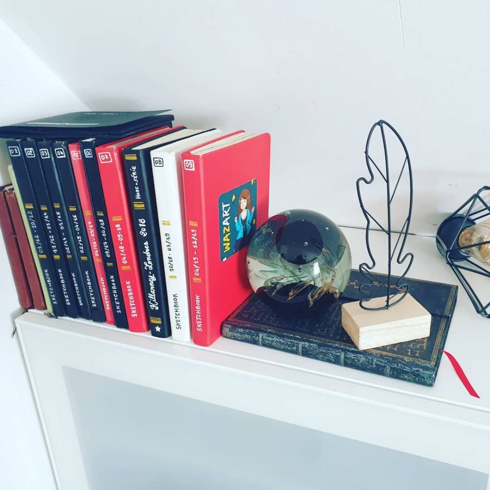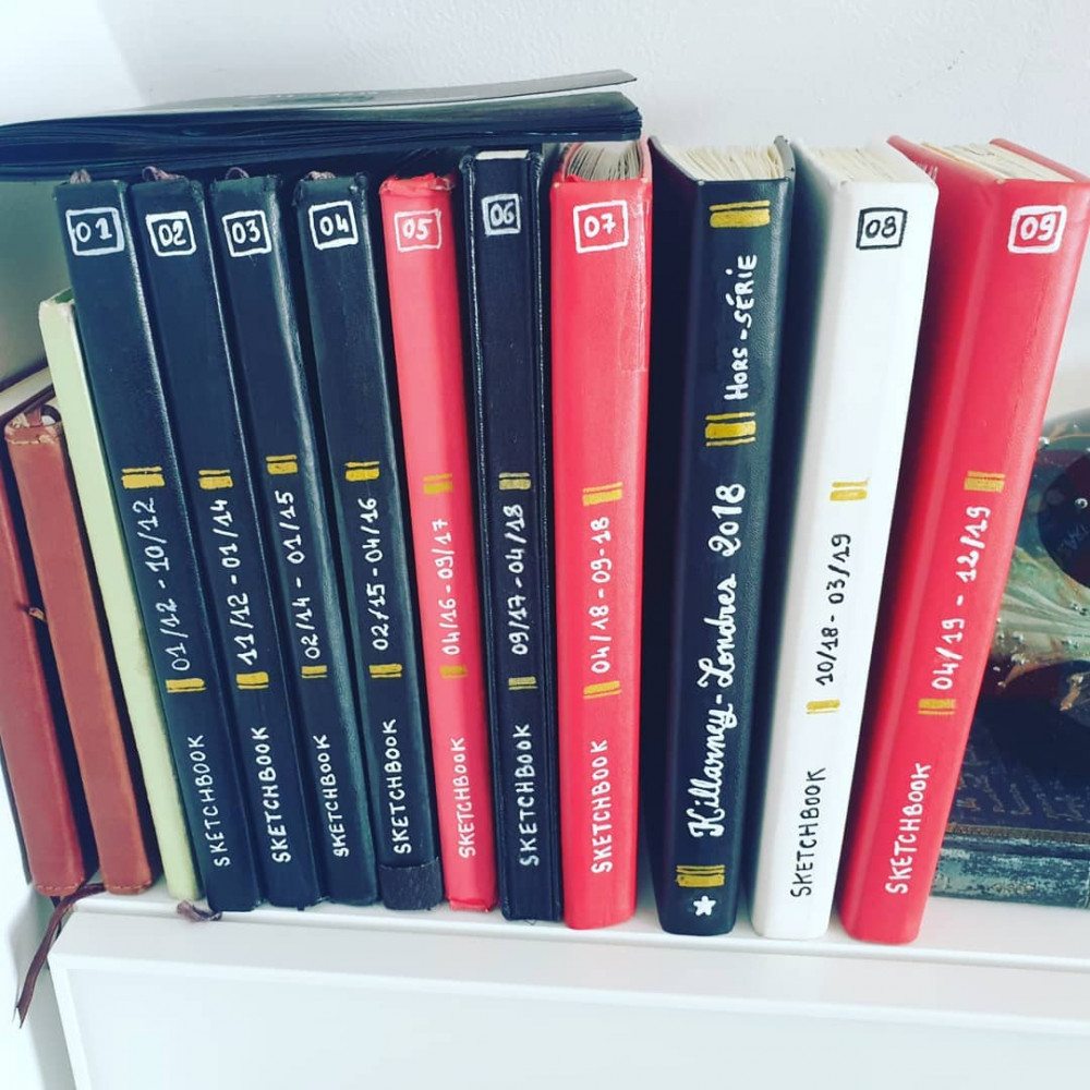 Sinon, mes autres instatrucs du moment. Ça fait un bail que je dessine dans des carnets type Moleskine, tout simplement parce que ça me permet de l'emmener partout, et que ça regroupe le bazar au lieu de semer des feuilles volantes aux quatre coins de la baraque. Depuis le temps, les carnets s'accumulent et jusqu'ici, je les avais différenciés de manière, disons... très sommaire :