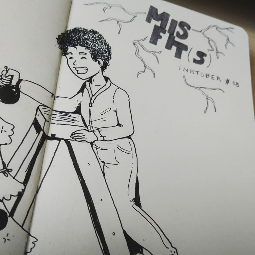 Pour "misfit", j'ai à nouveau essayé de sortir de ma zone de confort, en tentant des dessiner Nathan de la série Misfits. Rétrospectivement je regrette de ne pas avoir noué le haut de sa combinaison autour de sa taille, comme on le voit souvent dans la série. Ça, et fuck l'anatomie 😆