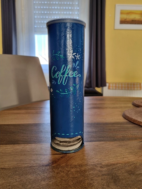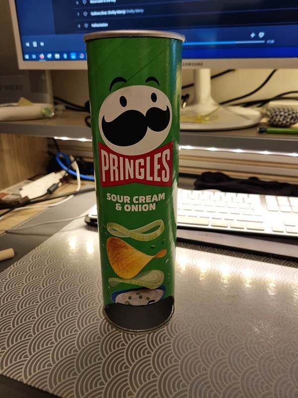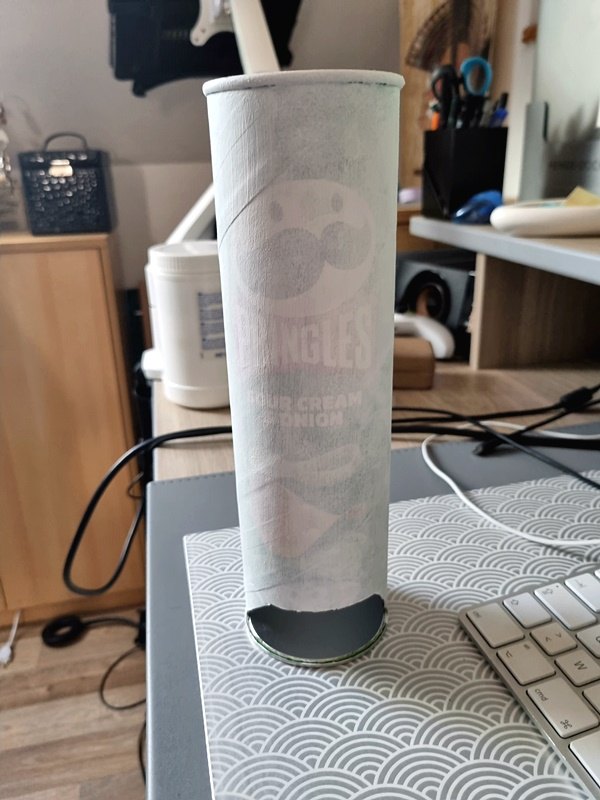 En substance, il faut attraper une boîte de Pringles, s'empiffrer le contenu, nettoyer la boîte... et créer une ouverture à la base, assez large pour laisser passer une ou deux dosettes :