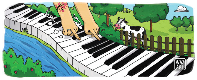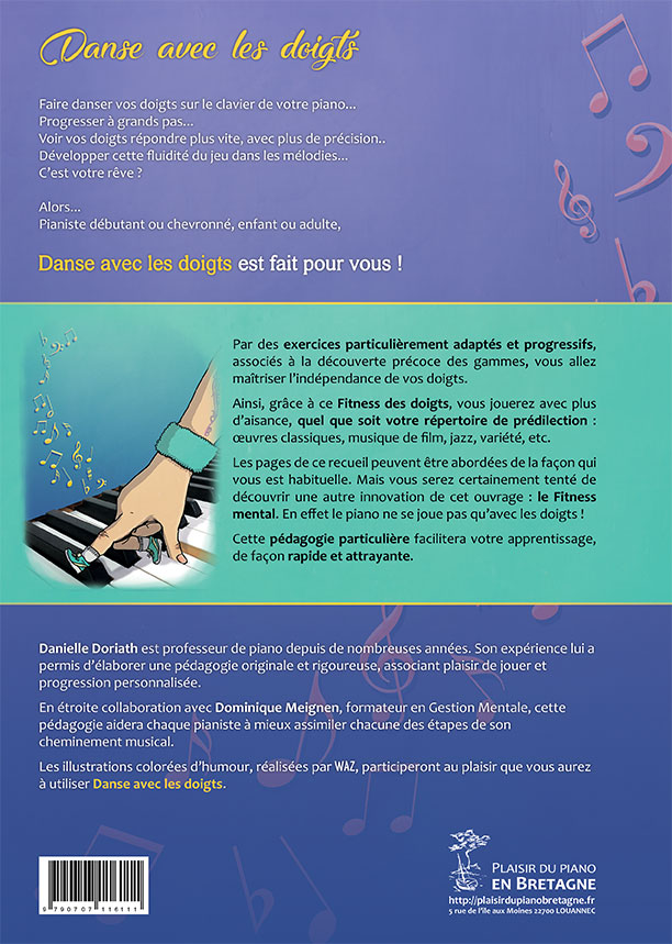 Un recueil d'exercices de piano, c'est austère (ouvre un Hanon, tu verras...). Danielle souhaitait rendre son livre attrayant, coloré, amusant... et m'a fait l'honneur de me confier la réalisation des visuels. Ainsi, l'ouvrage est parsemé de plus de quarante illustrations toutes en couleurs, parfois jolies, parfois humoristiques (souvent les deux, espéré-je), généralement en lien avec les exercices. J'ai également réalisé la couverture, et travaillé en collaboration avec Dominique sur les belles illustrations du préambule. Résultat : un ouvrage intelligent, innovant et, n'ayons pas peur des mots : plutôt joli :-) Soit dit en passant, c'est une chouette idée de cadeau de Noël (à offrir ou à se faire offrir), je dis ça je dis rien !