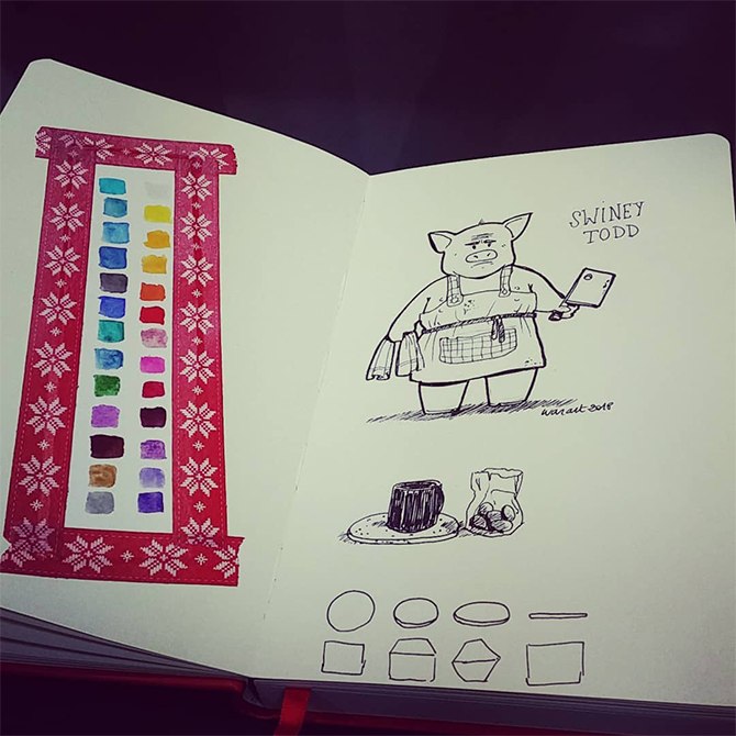 J'étais partie sur des jeux de mots cochons... et je me suis aussi fait un petit nuancier de ma boite d'aquarelles, parce que j'en avais marre de devoir tester tous les godets à chaque fois que je cherchais une couleur !