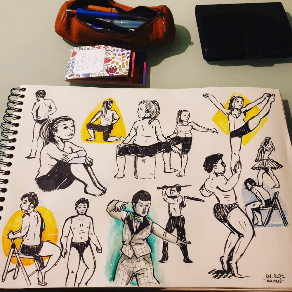 En bonus, une page de carnet A3 d'esquisses réalisées directement au brushpen Pentel (feutre-pinceau à l'encre de Chine) sans croquis préalable, d'après des poses de 2 à 5 minutes sur la base des photos proposées par le site Line of Action.