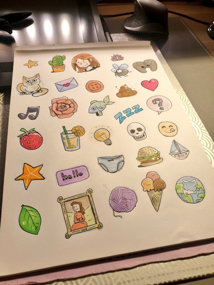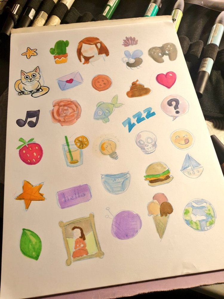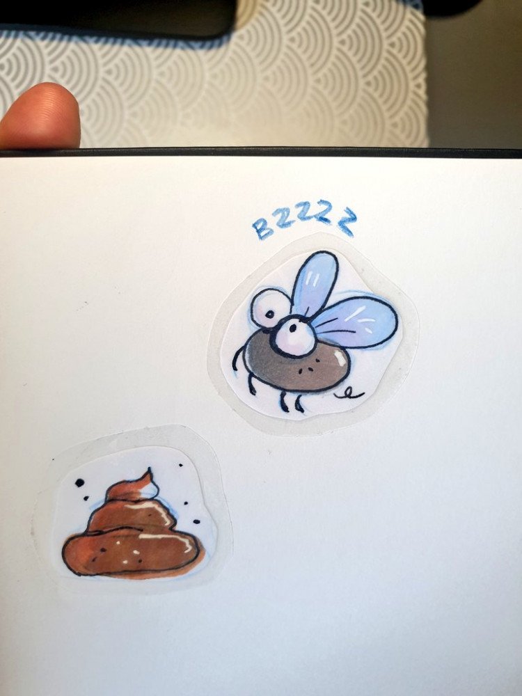 Etape 1 : dessiner (ou imprimer) les stickers, merci Captain Obvious. Je suis partie sur du Promarker (feutres à alcool), seule technique pour laquelle je pose d'abord la couleur, puis le trait - car sinon ça bave. Petit "work in progress", quand j'ai commencé l'encrage :
