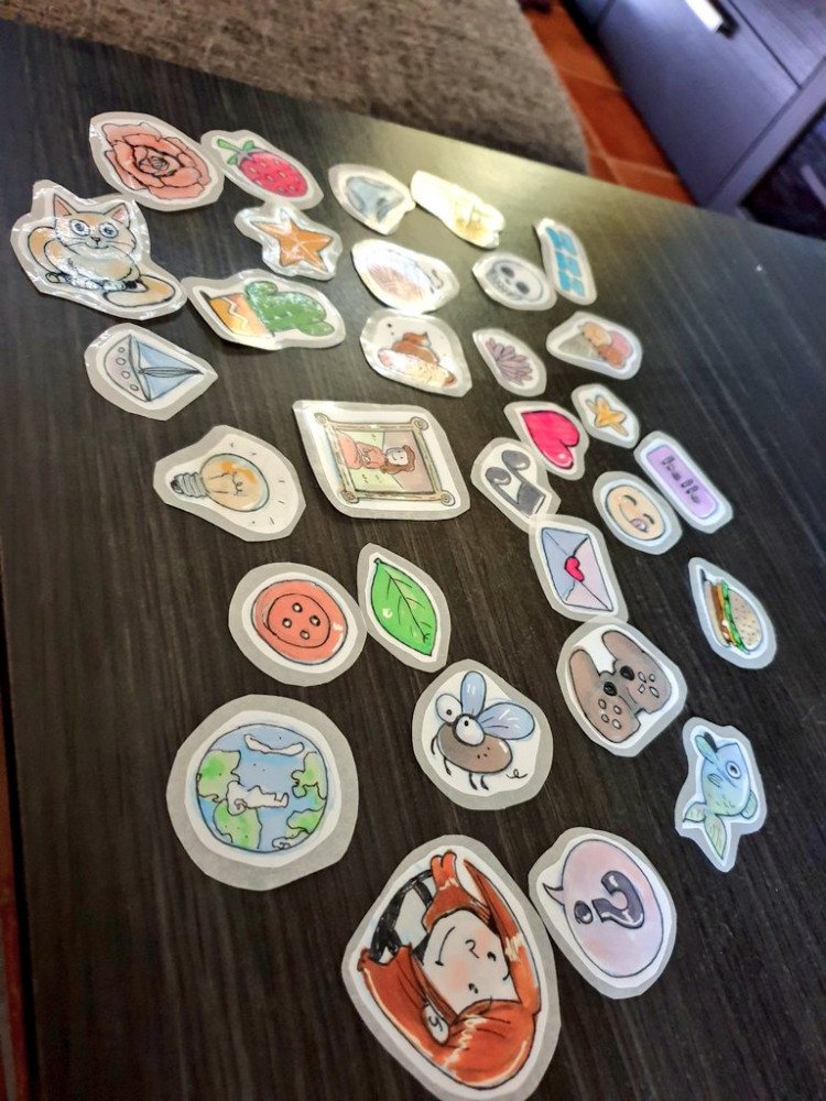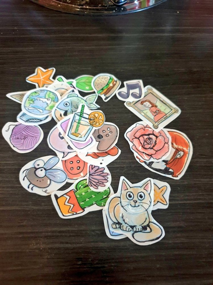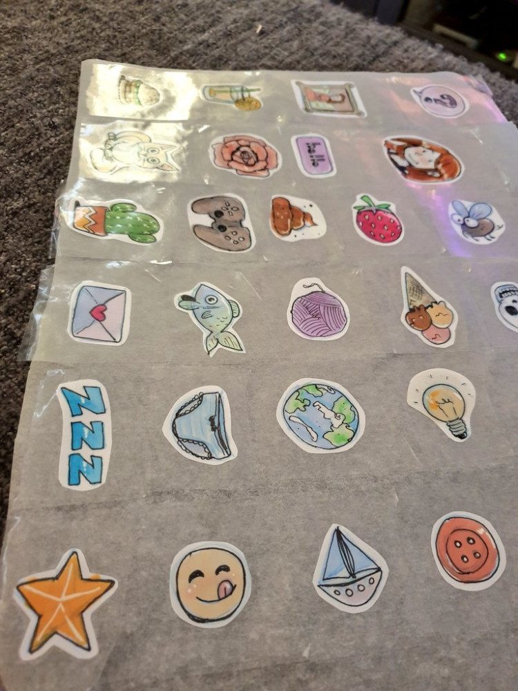 Etape 2 : découper les p'tits stickers (qui sont pour le moment juste des bouts de papier, évidemment). Personnellement j'ai laissé un contour blanc autour car ça simplifie le découpage (on "lisse" les bords)... mais ce n'est pas obligatoire. Si vous préférez découper au plus proche, je vous conseille néanmoins de faire les contours bien épais, pour éviter de mordre dans les dessins !