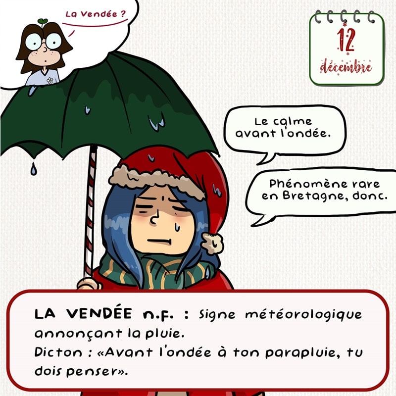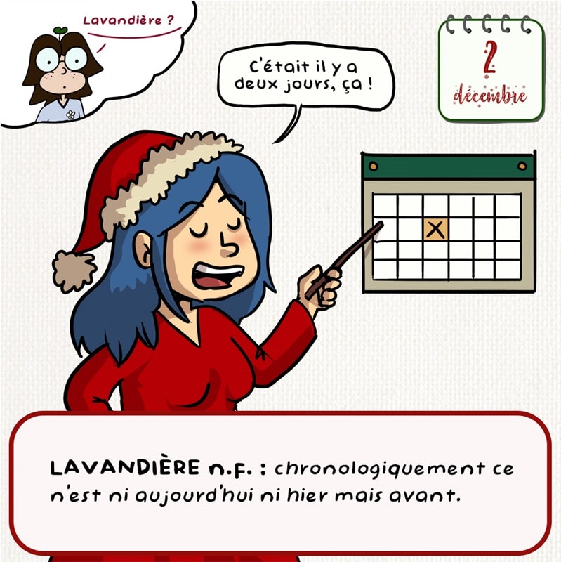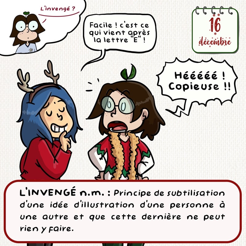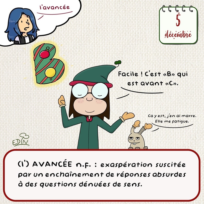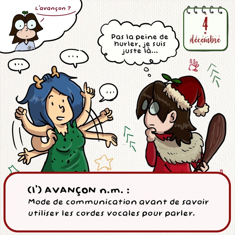 Nous avons établi une liste de mots commençant (plus ou moins) par la sonorité "avent"... Enfin, c'est Elo qui a quasiment tout proposé !. La suite s'est déroulée ainsi : les jours impairs, elle réalisait une illu en rapport avec le mot, et je devais improviser une définition reliant le mot et le dessin.