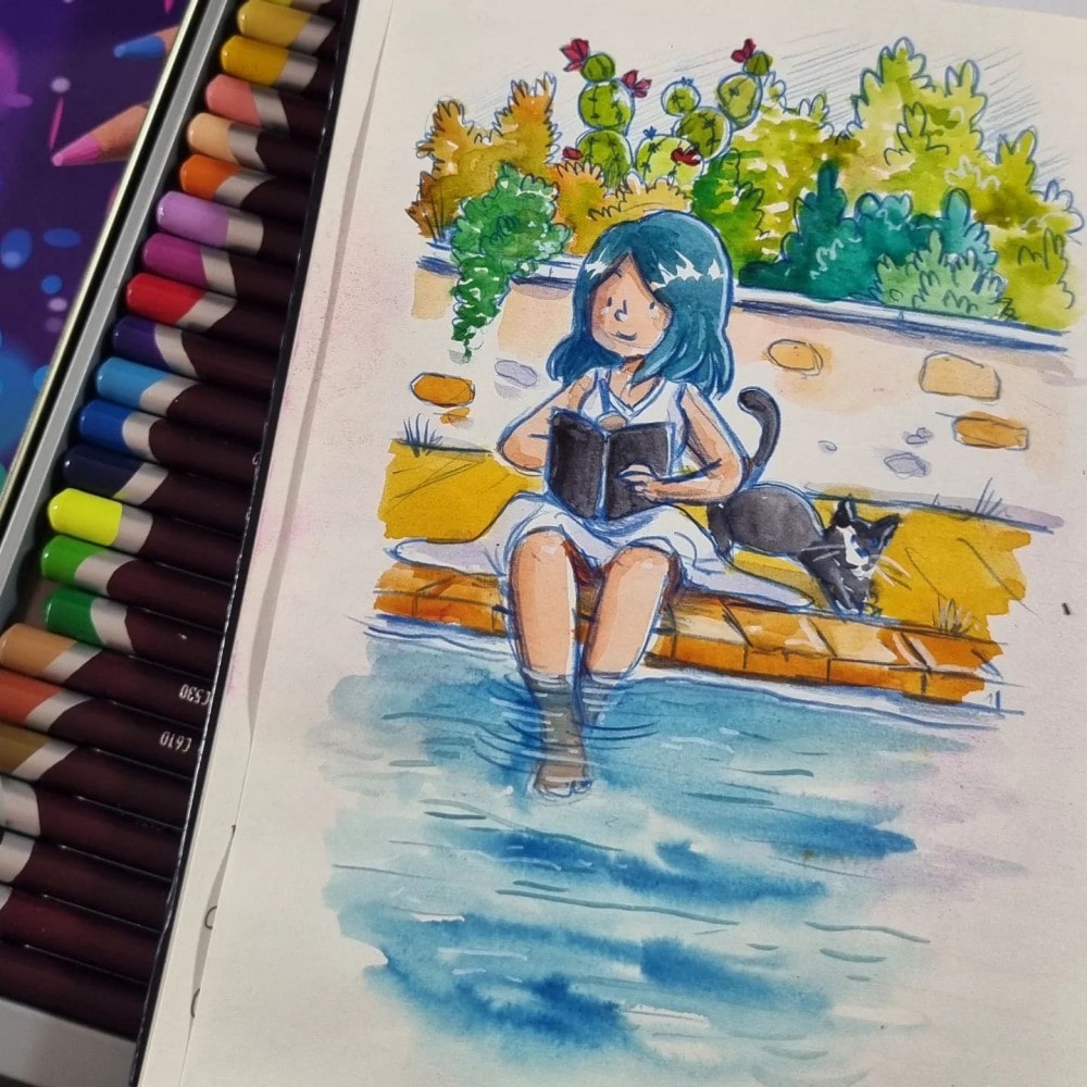 Ce soir-là, Ephysciences m'a défiée de lui dessiner un "moine de thé". J'ai griffonné un petit quelque chose en laissant libre cours à mon imagination, et comme le résultat me plaisait bien, j'ai décidé pour une fois d'en faire une illustration plus aboutie à l'aquarelle.