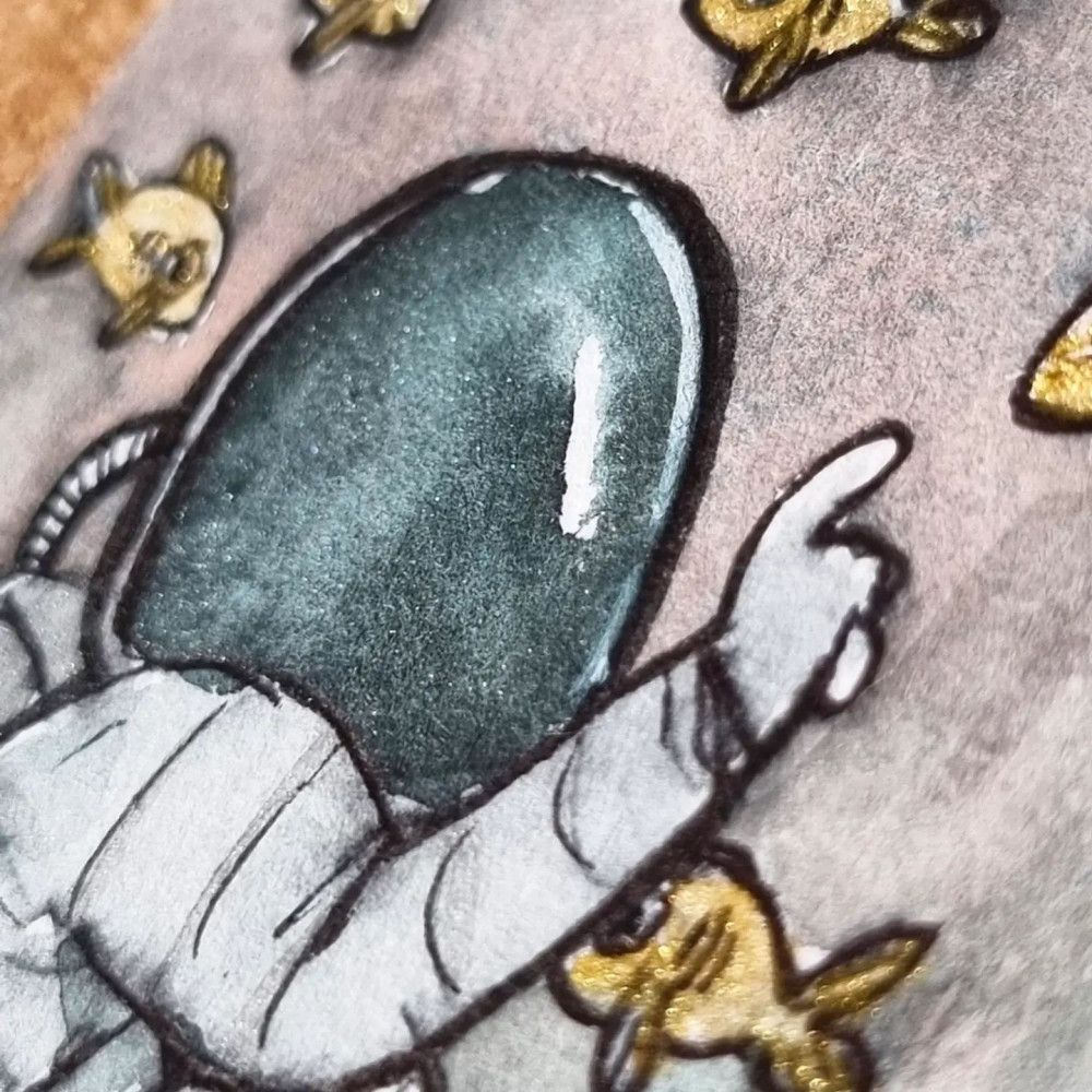 Je me suis trompée en voulant repasser de la couleur sur le casque : j'ai pris des paillettes argentées. Le résultat est accidentel mais plutôt chouette :