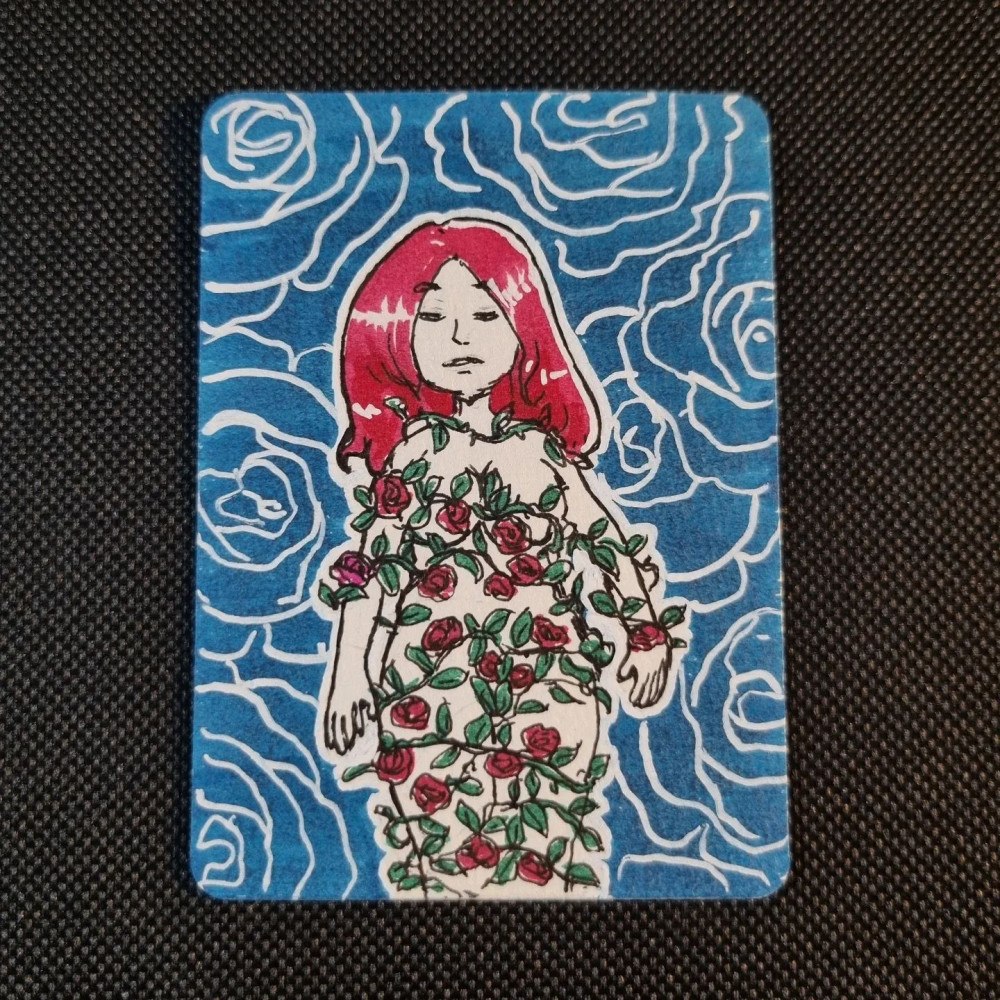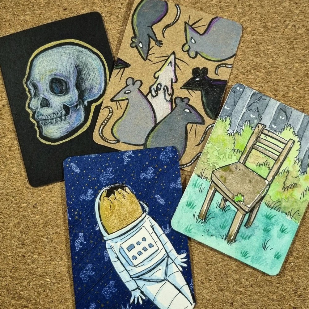 *Artist Trading Cards, "Cartes de collection d'artiste", créées sur papier épais au format carte de collection (64 mm x 89 mm) en tradi : crayons, stylos, feutres, peinture, broderie, collage... Le principe consiste à échanger les originaux avec d'autres artistes - on ne propose bien sûr que les cartes que l'on a soi-même réalisées.
