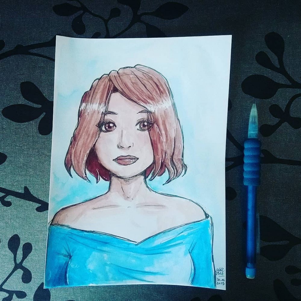 Et mon essai, que je trouvais trop éloigné de l'original et vaguement foiré, mais qui à ma surprise, semble avoir plu. Mélange de feutres Faber-Castell et crayons de couleur :