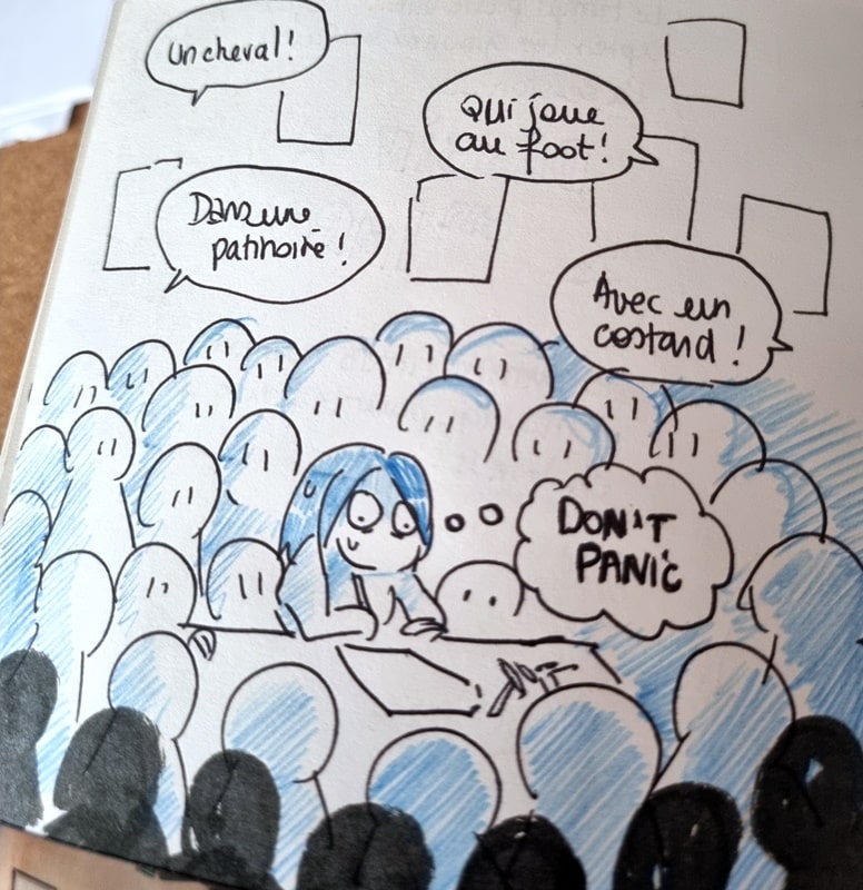 On a également organisé une soirée "dessin en impro" (thème proposé : "un cheval en costard qui joue au foot dans une patinoire). Jamais je ne me serais imaginée en train de dessiner avec autant de monde se pressant autour de la table, dans un silence religieux ponctué de compliments. C'était assez dingue, pour être honnête.