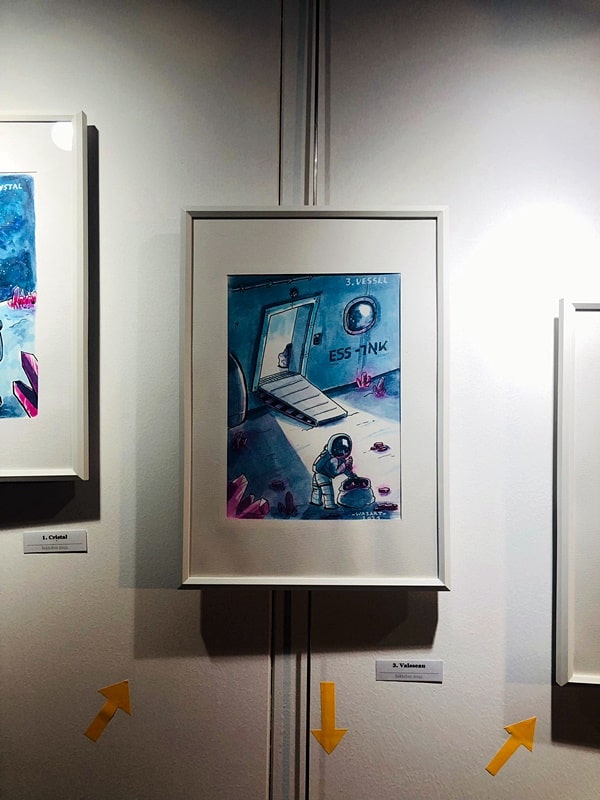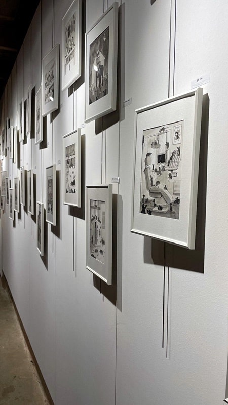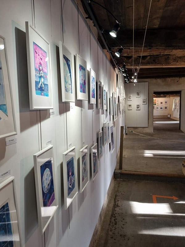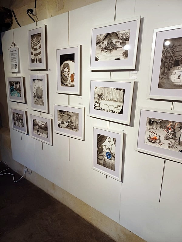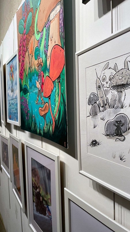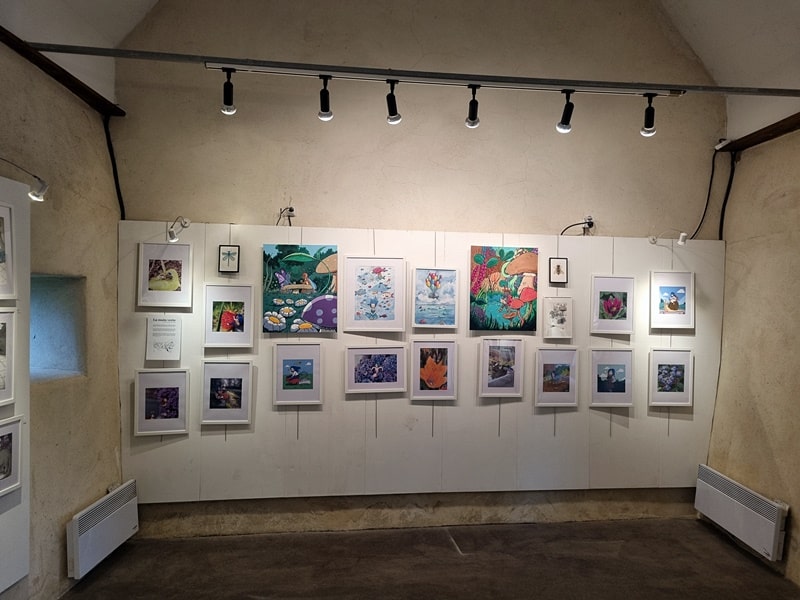 Un petit tour de la double salle, avec dans l'ordre : dans la première salle, les inktonautes et les rats, et dans la seconde, la TV avec mes vidéos YouTube, l'inktober "aventurière et son dragon", un coin "inspiration nature", et une section bazar avec, notamment, les "croûtes" que je fais sur Twitch (mais pas que).