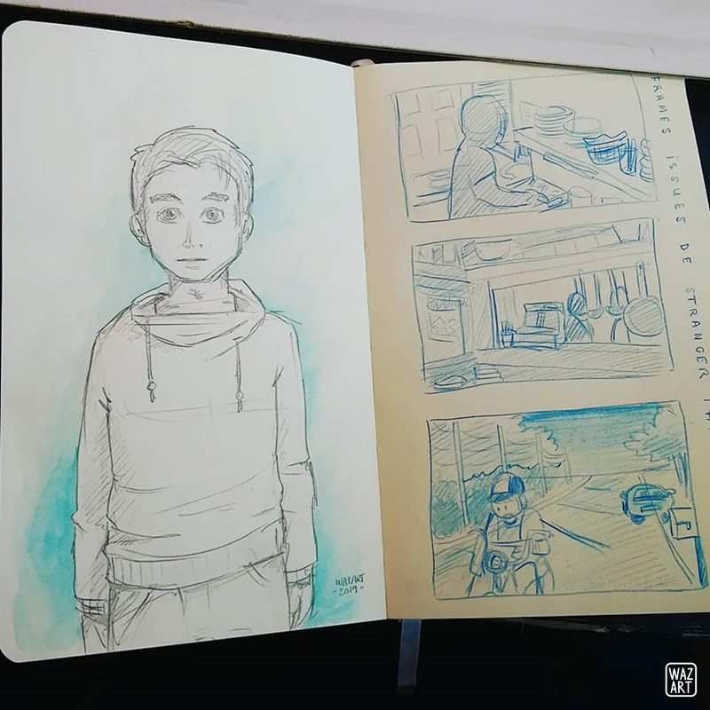 Un croquis/aquarelle, et sur la droite tu peux voir que je m'entraîne à griffoner rapidement des screenshots tirés d'épisodes de séries pour de films, pour en étudier la composition :